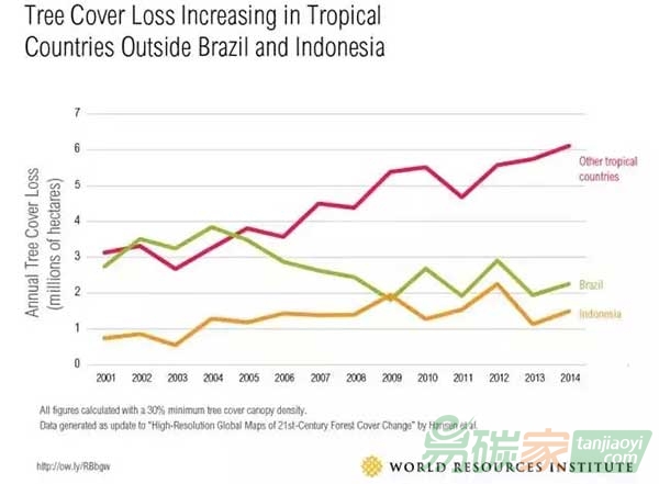 但是,巴西和印尼并不能反映全球情況。2014年,62%以上的熱帶森林流失出現(xiàn)在巴西和印尼以外的國家,而2001年這一比例只有47%。