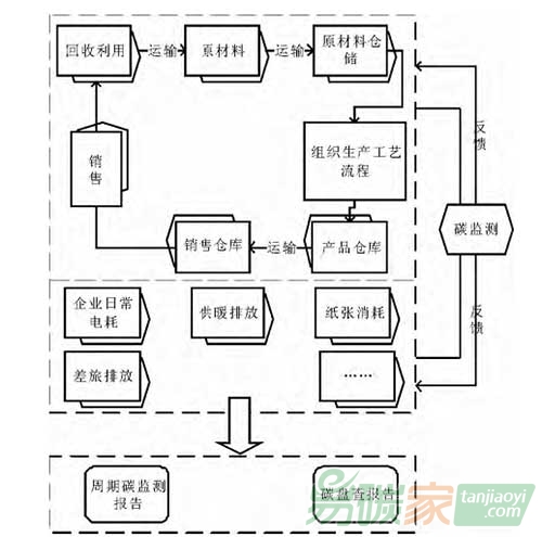 碳管理部門報(bào)送運(yùn)輸信息;如是供應(yīng)商對(duì)原材料進(jìn)行運(yùn)輸,則在這一環(huán)節(jié)便不會(huì)產(chǎn)生碳排放。當(dāng)原材料進(jìn)入倉儲(chǔ)環(huán)節(jié),由主管倉儲(chǔ)的部門將運(yùn)進(jìn)原材料的數(shù)量、設(shè)定倉儲(chǔ)燈光亮度,溫度等一系列信息報(bào)送到碳管理部門。組織生產(chǎn)工藝流程根據(jù)企業(yè)運(yùn)營實(shí)際情況設(shè)定流程圖,運(yùn)營活動(dòng)信息根據(jù)真實(shí)發(fā)生情況向碳管理部門匯報(bào);企業(yè)支持性活動(dòng)(非生產(chǎn)過程)中所產(chǎn)生的業(yè)務(wù)由主管部門將詳細(xì)信息匯報(bào)給碳管理部門即可。碳監(jiān)測(cè)與盤查報(bào)告編寫的任務(wù)由碳管理部門來完成。企業(yè)碳盤查流程可設(shè)計(jì)如圖2所示