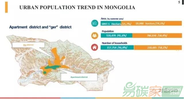 在烏蘭巴托人口數(shù)量并不是造成環(huán)境和社會(huì)巨大壓力的唯一原因。下圖是烏蘭巴托的地圖,可以看到綠色的占地面積非常小的部分是公寓區(qū)域;黃色的占地面積比較大的是傳統(tǒng)的蒙古包區(qū)域。但是住在黃色區(qū)域很難獲得相關(guān)的基礎(chǔ)設(shè)施,比如能源、供電和排水等設(shè)施。因此很多人想遷居到烏蘭巴托,以便在城市里享受更好的教育、找到更好的工作,生活也可以得到相應(yīng)的改善。這就造成了城市的環(huán)境、社會(huì),甚至是經(jīng)濟(jì)上的壓力。