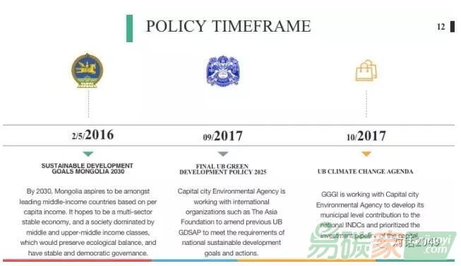 目前,烏蘭巴托在上圖所示的框架下來(lái)推進(jìn)實(shí)現(xiàn)2025綠色發(fā)展政策,包括:增強(qiáng)與不同利益相關(guān)方的合作;在金融和財(cái)政上給予足夠的鼓勵(lì)和刺激政策;鼓勵(lì)創(chuàng)新和先進(jìn)技術(shù)的發(fā)展;展現(xiàn)領(lǐng)導(dǎo)力,促進(jìn)最佳實(shí)踐;加強(qiáng)機(jī)構(gòu)的能力;提升認(rèn)知度,進(jìn)行有效的溝通和對(duì)話。