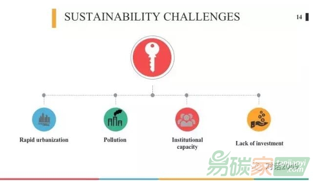 我們認(rèn)為一個(gè)可持續(xù)發(fā)展的城市需要在社會(huì)、經(jīng)濟(jì)、環(huán)境和城市治理方面有四個(gè)支柱。具體來(lái)講,每一個(gè)支柱下面都有其所涵蓋的目標(biāo)??沙掷m(xù)性的社會(huì)里面包含了綠色的城市交通、綠色建筑和擁有綠色生活方式的市民;可持續(xù)性的環(huán)境包括:清潔空氣、水、土壤,零廢棄物以及應(yīng)對(duì)氣候變化的韌性;可持續(xù)性的經(jīng)濟(jì)包括:綠色就業(yè)機(jī)會(huì),對(duì)環(huán)境友好的商業(yè),同時(shí)這個(gè)城市能夠支持綠色采購(gòu);可持續(xù)的城市治理包括:城市規(guī)劃和去中心化、減少不平等和支持本地、國(guó)內(nèi)、區(qū)域乃至國(guó)際的鏈接和資源共享。