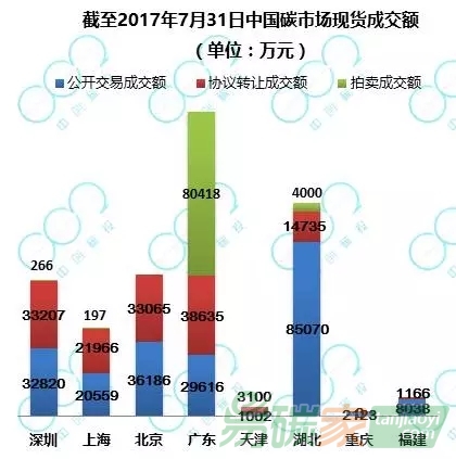 7月,8個區(qū)域碳市場共成交配額780萬噸,交易額1.09億元,分別比2017年6月下降了59.6%和74.7%。截至2017年7月31日,一、二級現(xiàn)貨市場累計成交1.93億噸,成交額44.62億元。
