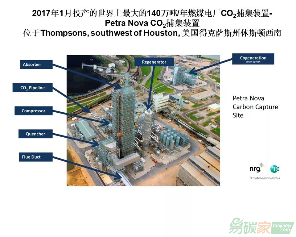 這是目前世界上最大的140萬噸/年燃煤電廠CO2捕集裝置(美國的Petra Nova)。140萬噸燃燒后捕集。