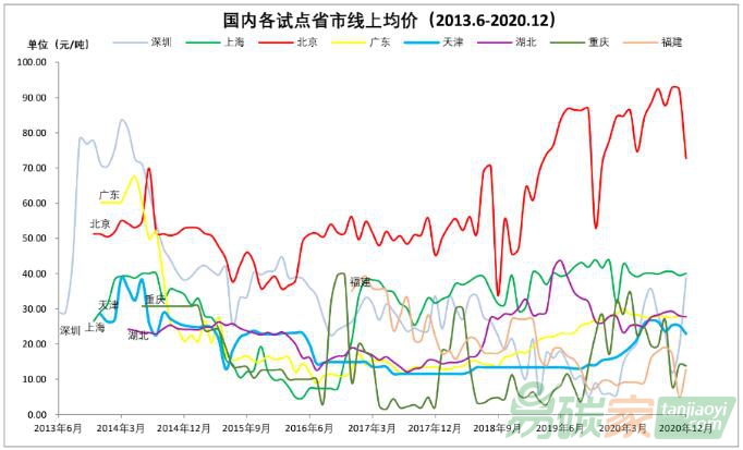 圖為國內(nèi)各試點(diǎn)省市線上均價(jià)(來源:天津排放權(quán)交易所)